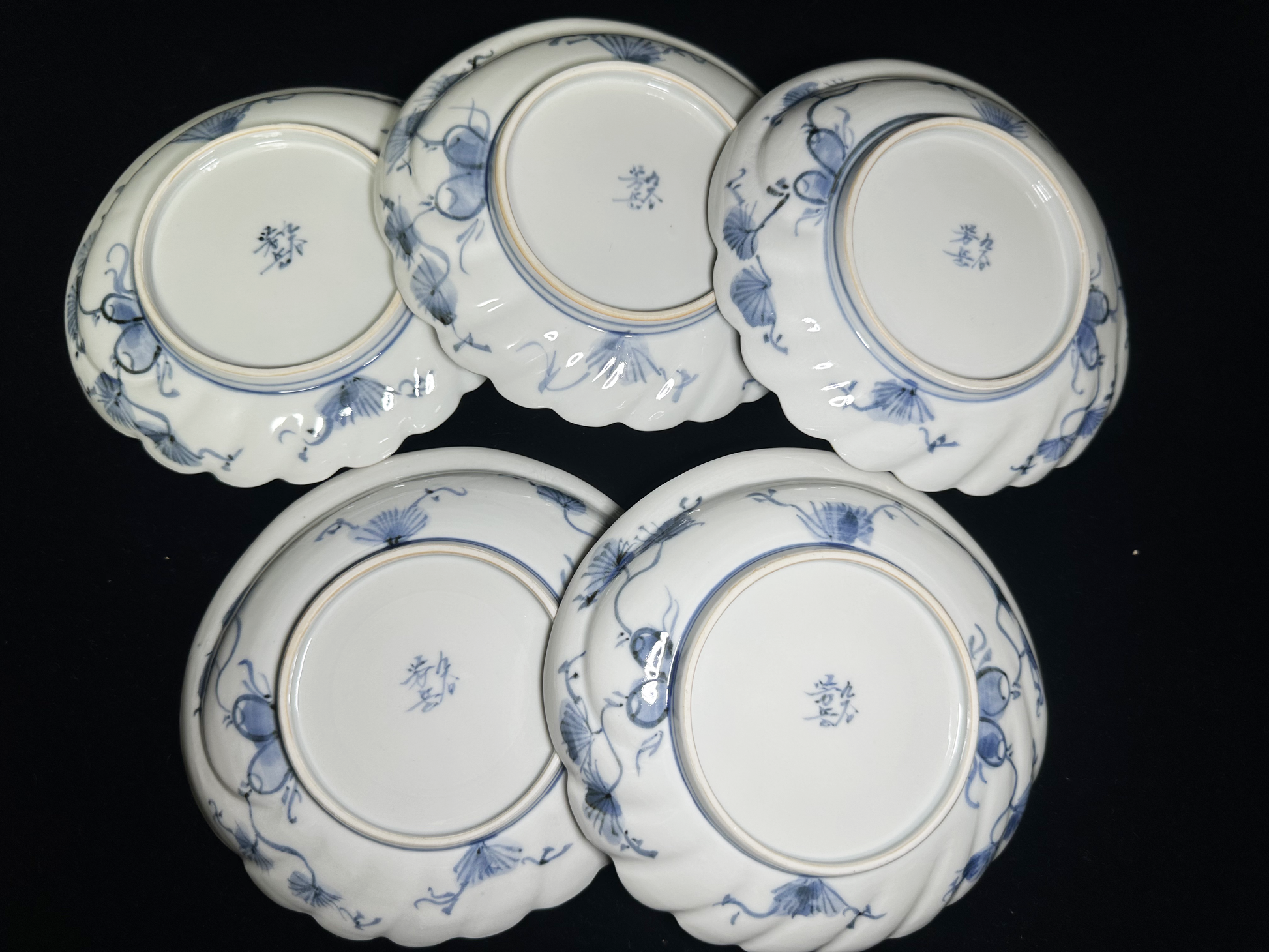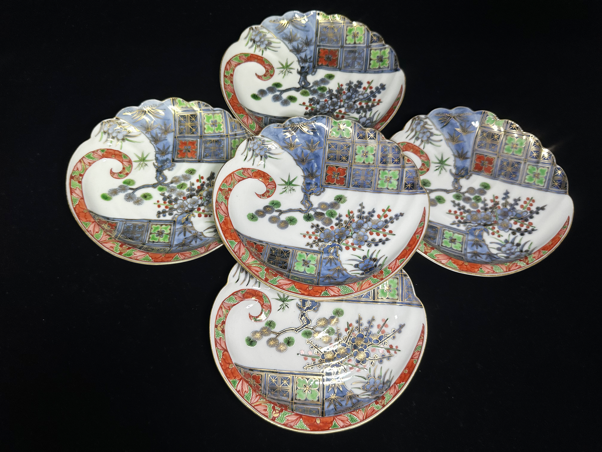 Elegant Design: Each plate features a delicate scalloped/fan-shaped rim and utilizes traditional Japanese motifs, often including the pine, bamboo, and plum (Sho-Chiku-Bai)—symbols of good fortune and resilience.