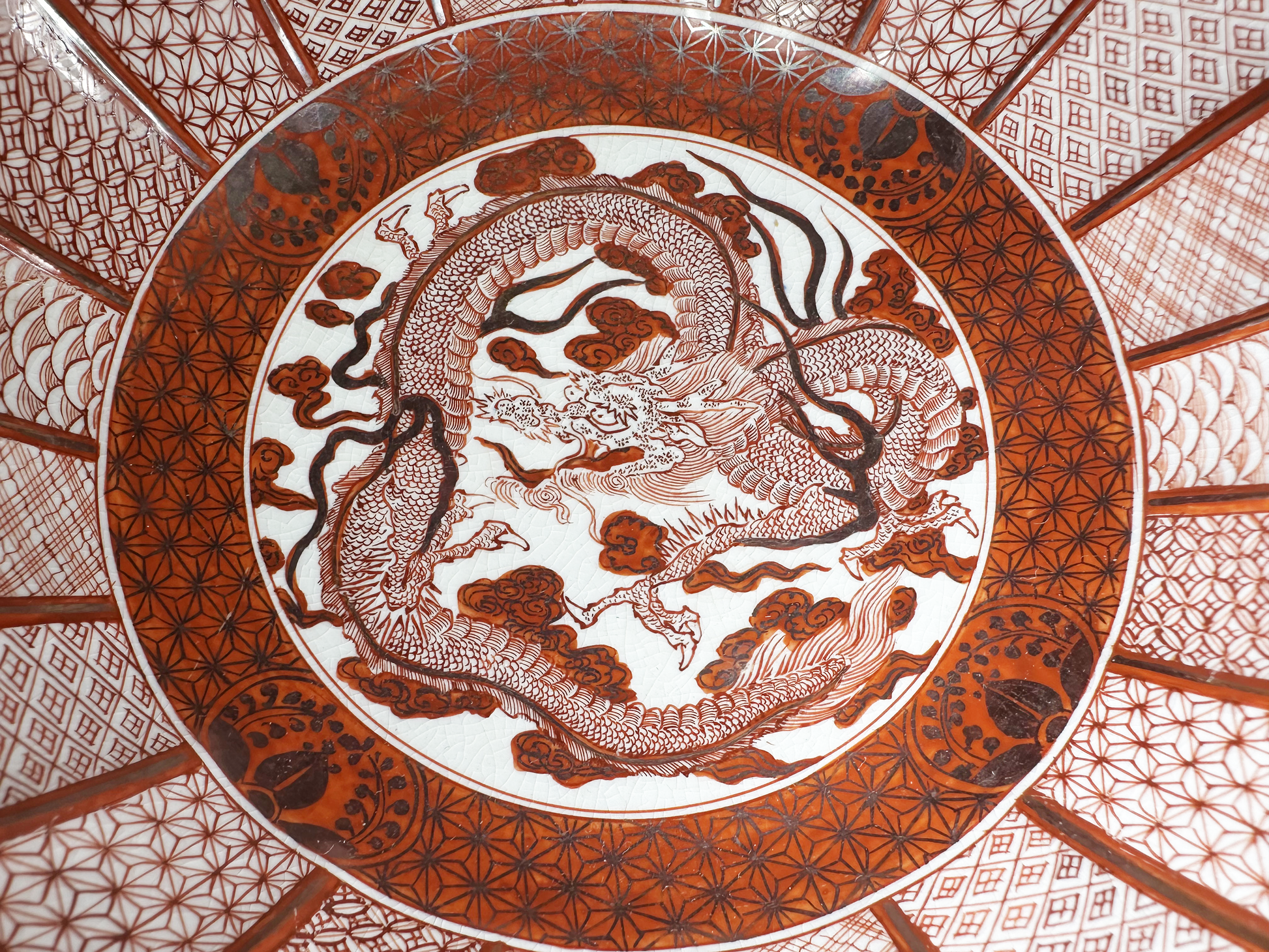 Characterized by the distinctive Kutani technique, the bowls feature elaborate scalloped rims and are lavishly decorated with iron-red enamel (bengara) and fine gold accents. The centerpiece of each bowl is a dynamic, powerful dragon (ryu), a traditional symbol of power, fortune, and imperial authority, hand-painted with meticulous detail.