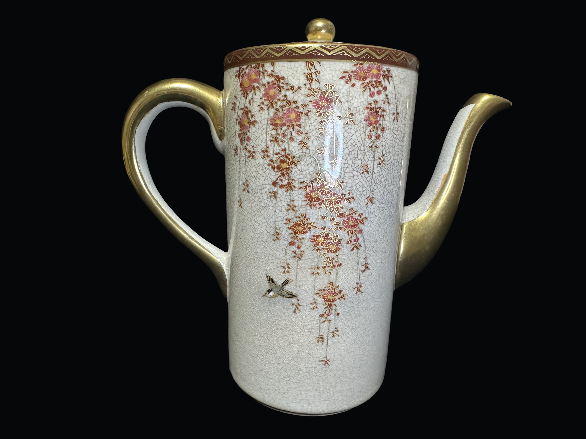 This is a magnificent and rare antique Japanese tea and coffee set, crafted in the highly sought-after Satsuma style, comprising a tall coffee pot, a lidded sugar bowl, and several matching cups and saucers. Dating back over a century (Meiji/Taishō Period), this collection represents the pinnacle of Japanese export ceramic artistry.