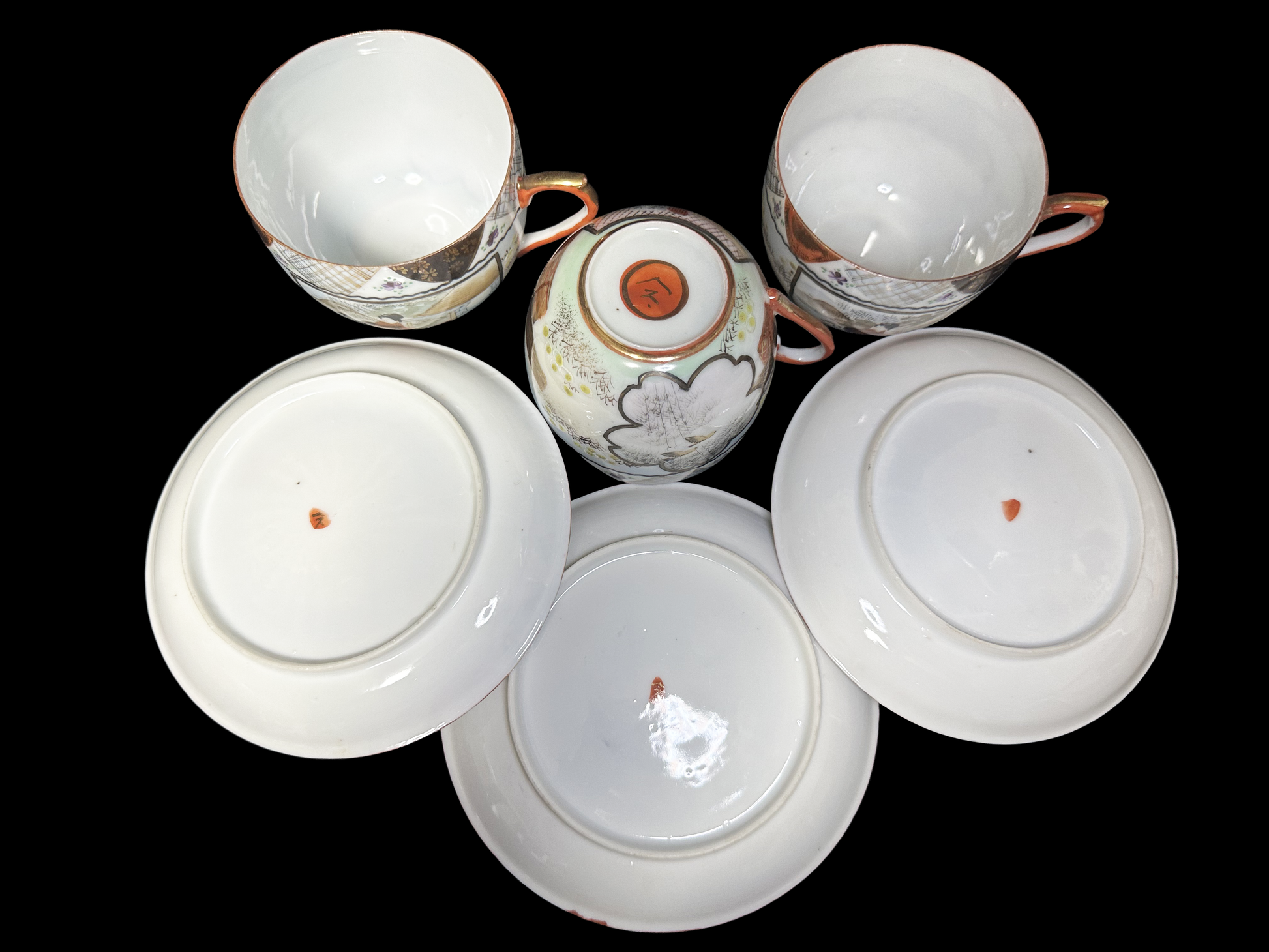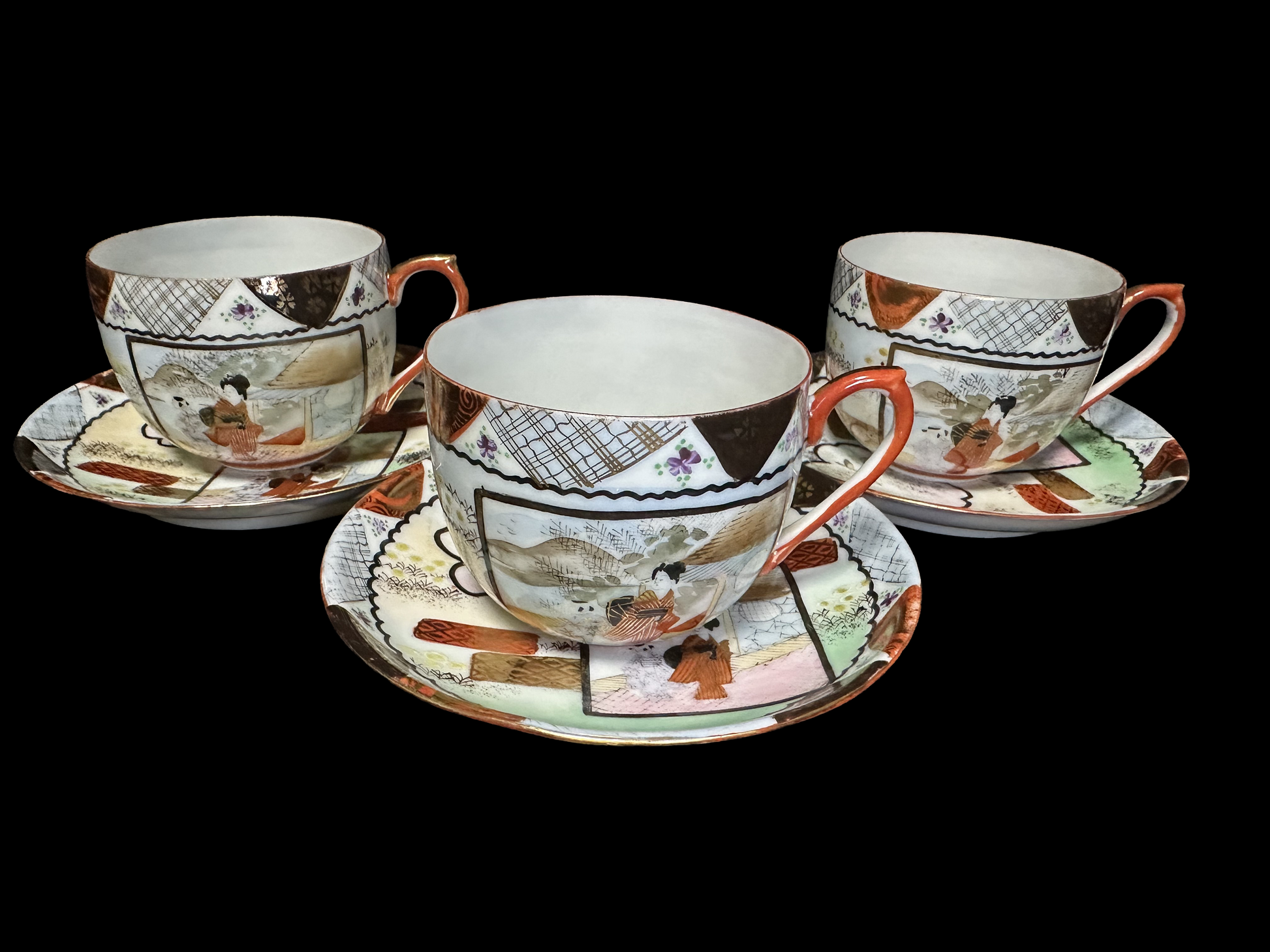 This is an exquisite antique Kutani porcelain coffee cup and saucer set, dating back over a century. It is a superb example of Hakutai (薄胎, or thin-walled porcelain), a rare type of Japanese pottery fired to such an extreme thinness that the intricate, hand-painted patterns become beautifully translucent when held up to the light. This piece is a testament to the masterful artistry and delicate technique of a craftsman from over 100 years ago.